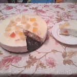 Выкладываем в форму половину смеси, присыпаем кусочками персиков (этот шаг не обязателен! Если будете класть кусочки фруктов - не повторяйте мою ошибку, не выкладывайте их по всей форме, оставьте по см до бортика - я выложила до конца и чиз был не очень устойчив - пытался уехать по фруктам)