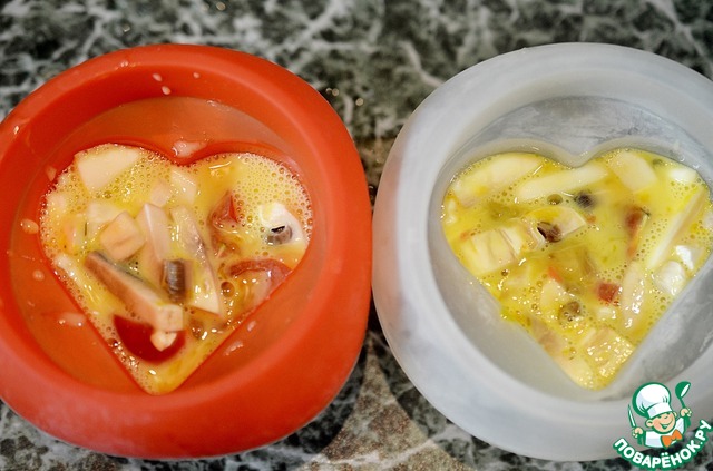 При желании посолить и довести до готовности или на сковородк, или в микроволновке. Я разлила омлетную массу по силиконовым формочкам.