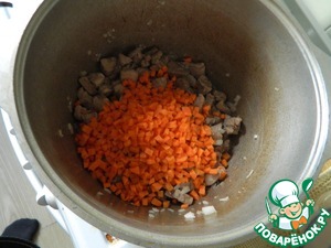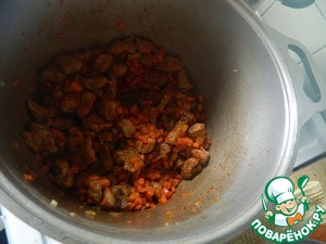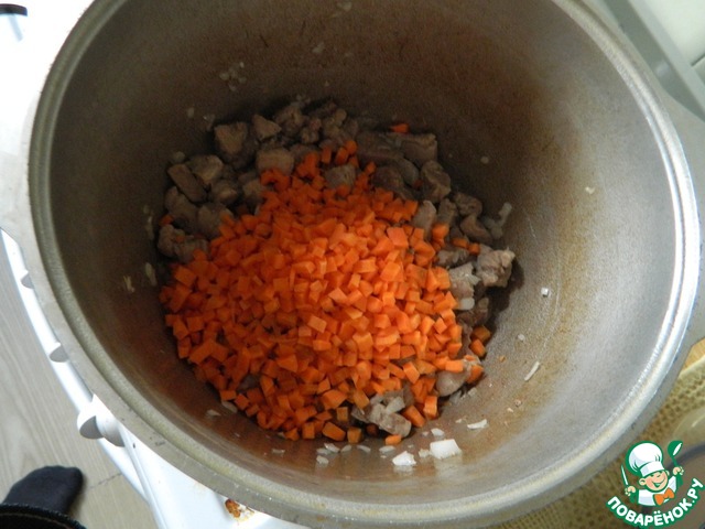 Мясо нарезаем размером с грецкий орех (или поменьше). Обжариваем. Кто как любит. Кто до корочки, а кто просто припустить минут 10. Тут лично для себя придумал трюк. При жарке мяса выходит сок, что-бы его не выпарить сливаю в кружку, отставляю. -