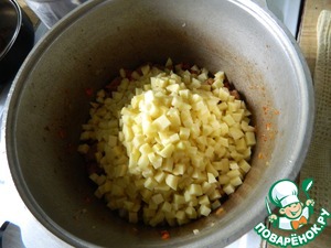 Закидываем картошку нарезанную кубиком чуть крупнее чем морковка, разравниваем ровную поверхность -