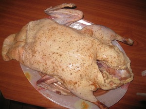 • Примерно за час до начала приготовления посолите, поперчите и побрызгайте лимонным соком вашу птицу, у меня сегодня утка.