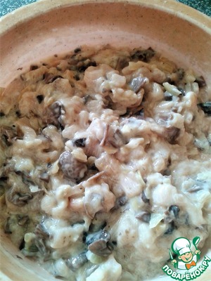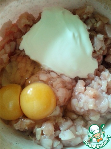 Чеснок пропустить через пресс. Смешать рубленное филе, грибы с луком, чеснок, измельчённую зелень, крахмал, сметану, посолить, поперчить и добавить яйца.