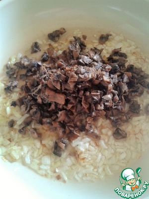 Грибы очистить, мелко нарезать, добавить к луку и обжарить на сковороде до выпаривания жидкости. У меня в морозилке всегда лежат уже готовые жареные грибы, поэтому я их просто добавляю к луку и слегка обжариваю для соединения вкусов.