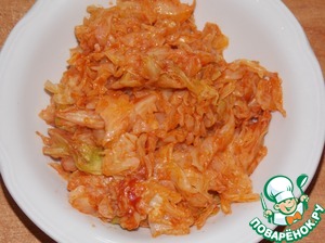 • Капусту обжарить на растительном масле с томатной пастой до готовности.