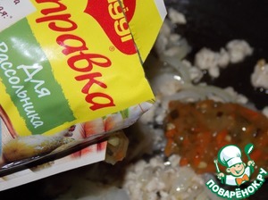 • Лук обжарить с фаршем до готовности, добавить заправку Магги, тушить 2 минуты.