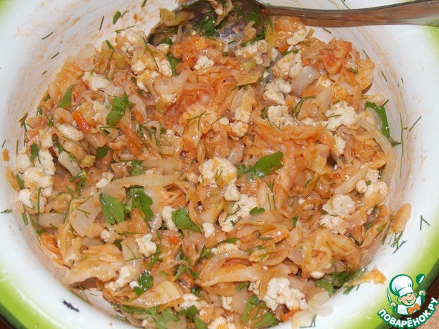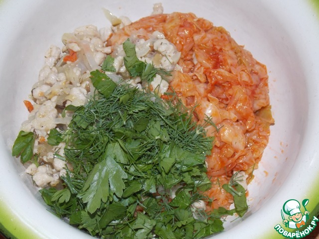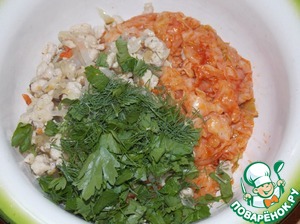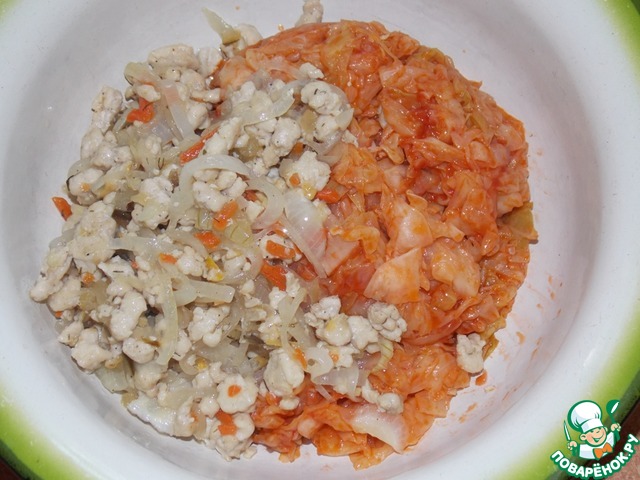 • Капусту и фарш с луком соединить.