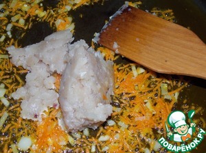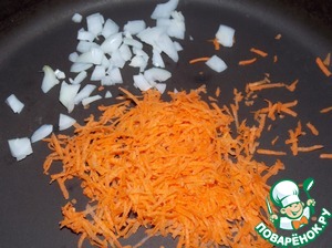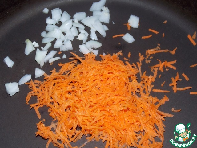 Лук мелко нарезать, морковь натереть на мелкой тёрке. Обжарить на растительном масле до золотистого цвета.