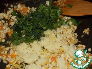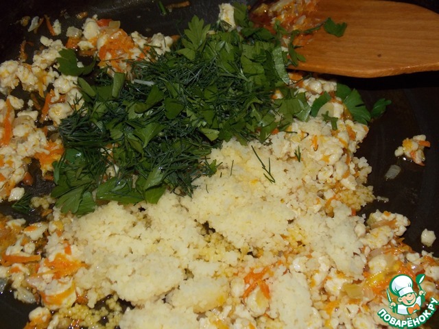 Добавить заранее приготовленный кус-кус, зелень, посолить и поперчить. Прогреть 2 минутки.