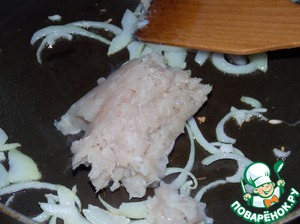 К луку добавить фарш, жарить 5 минут.