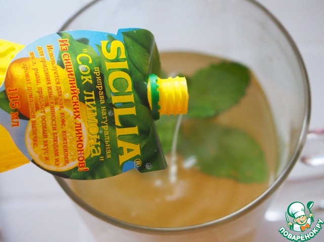 После полного остывания веточки мяты можно извлечь, а можно и оставить. Добавить лимонный сок. Если нет под рукой лимона, я использую лимонный сок SICILIA, который придает чаю натуральный аромат и вкус свежего лимона. Перемешать и чай готов.
