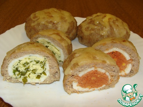 Берём кусок фольги или пищевой плёнки, смачиваем её водой или маслом. Выкладываем четверть фарша, формируя прямоугольник, кладём яйцо и формируем котлету (рулетик). Если Вам удобно, формируйте руками.