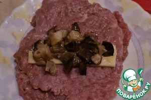 Выкладываем сверху сыра грибы и заворачиваем рулеты, закрепляем зубочистками.