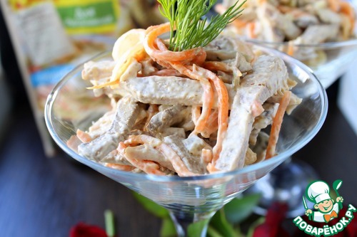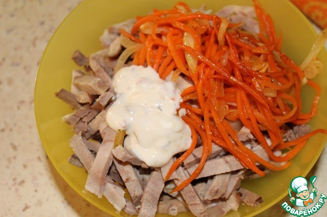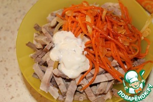 К нарезанному мясу и печени добавить обжаренные морковь с луком, заправку, посолить и поперчить по вкусу, перемешать. Перед подачей, салат охладить в холодильнике. Приятного аппетита!