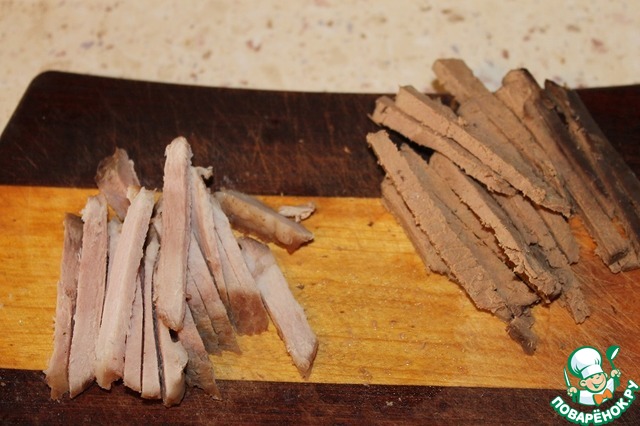 Свинину и печень нарезать тонкой соломкой.