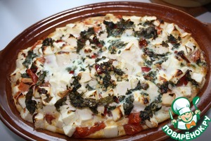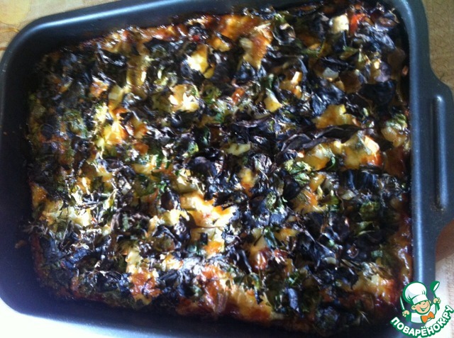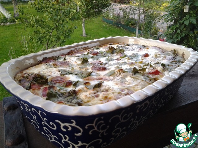 Залить молочно яичной заливкой и запекать 45 минут при темп. 190-200 град. -