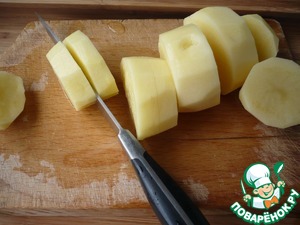 Картофель нарежем на шайбы и затем в каждой шайбе делаем разрез, но не до конца.
