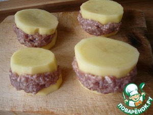 Заполняем пространство между картофельными кружочками мясным фаршем.