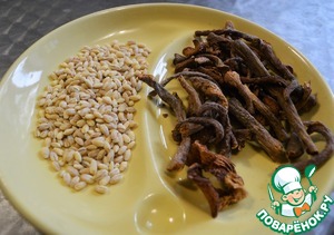 Оба варианта приготовления рассольника начнём с того, что замочим перловку и грибы. Перловку на 2-3 часа, грибам хватит и одного. По прошествии данного времени перловку и измельчённые грибы складываем в горшочек, заливаем стаканом кипятка и отправляем в духовку при температуре 200 градусов на 1 час.