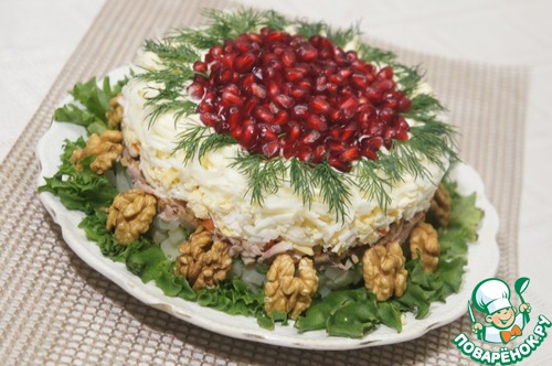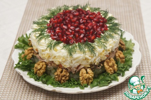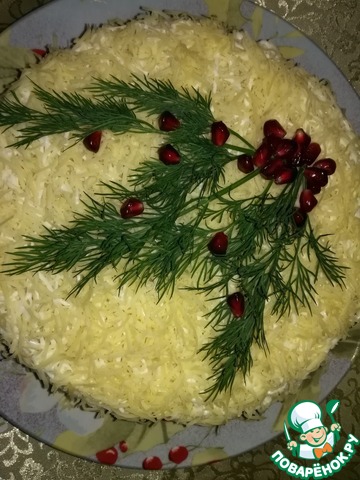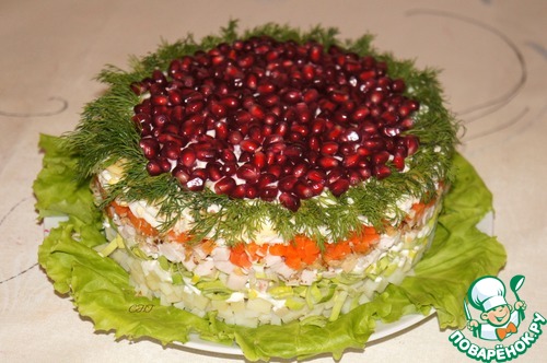 Верх салата по краю украсить укропом, а в середину выложить зерна граната.