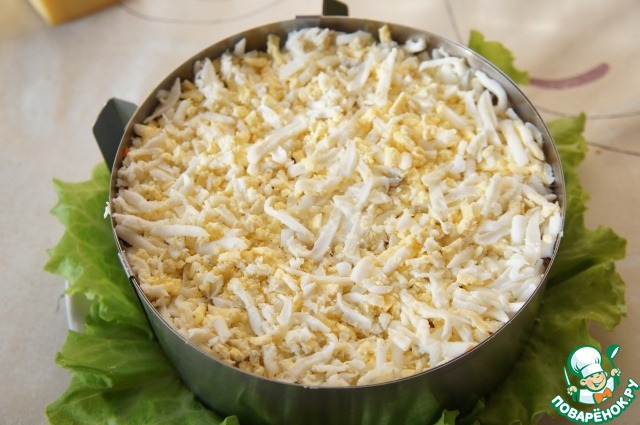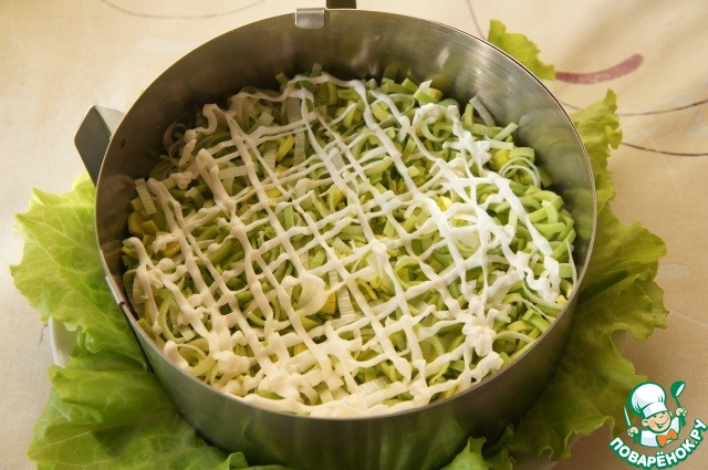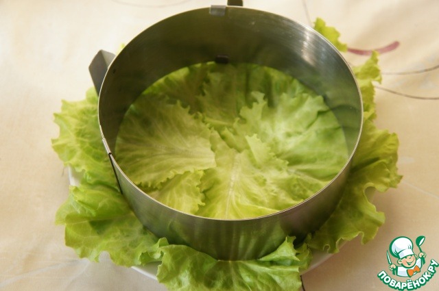 Плоское блюдо выстелить листьями зеленого салата. Установить кольцо.