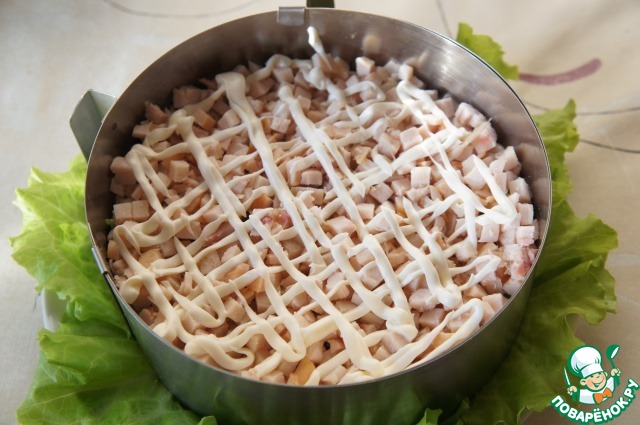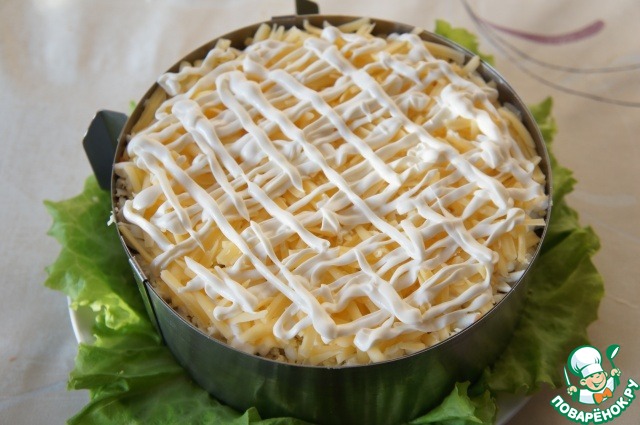 Равномерно распределить лук и снова нанести сеточку из майонеза.
