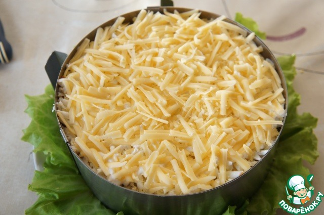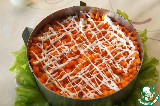 На орехи выложить морковь и снова... сеточка из майонеза.