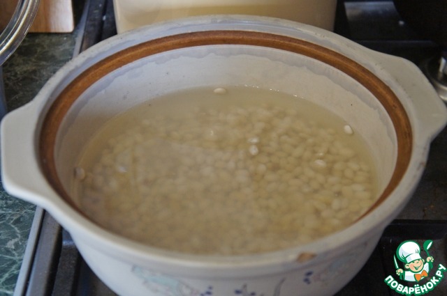 Воду слить, фасоль залить свежей, довести до кипения в керамическом горшке под крышкой, слить и снова залить холодной (так фасоль быстрее сварится). Довести до кипения, слить, залить бульоном и готовить на среднем огне 30 минут.
