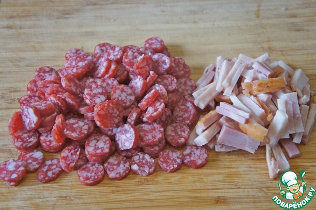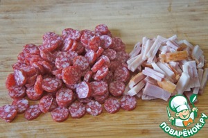 Тем временем нарезать грудинку соломкой, колбаски - кружочками.