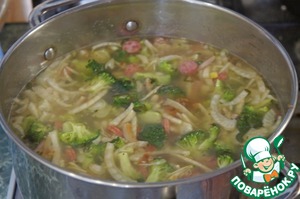 Добавить брокколи, фенхель, посолить, поперчить, готовить на среднем огне 30 минут.