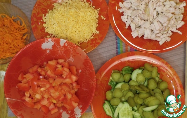 Нарезаем небольшими кусочками все ингредиенты для начинки: помидоры, огурцы, куриную грудку. Натираем сыр на мелкой терке.