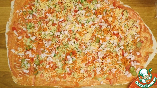 На расстеленный лаваш наносим тонким слоем смесь кетчупа с майонезом (томатной пастой), выкладываем все ингредиенты и немного присаливаем. Сверху посыпаем натертым сыром.