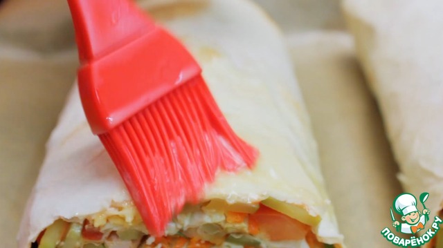 Сворачиваем лаваш в рулет, выкладываем на противень и смазываем сверху яйцом. Для удобства, я разрезала рулет на две части.