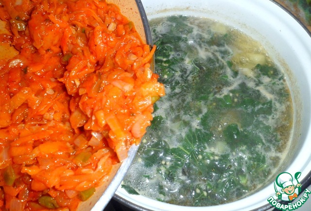 Все выкладываем в кастрюлю. Щавель здесь, как нельзя кстати, он отдает блюду свою кислинку и заменяет часть кислоты, что не приходится добавлять в суп рассол или лимонную кислоту.
