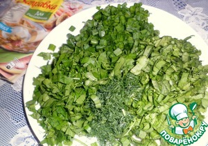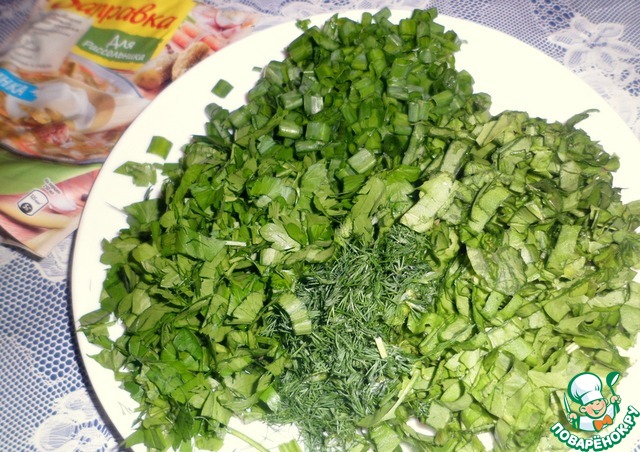 Тем временем нарезать зелень, щавель, стебли зеленого лука, укроп, петрушку.