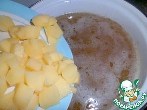 • У меня был готовый бульон, поставить его на огонь, как только закипит, выложить к нему картофель, нарезанный на кубики.
