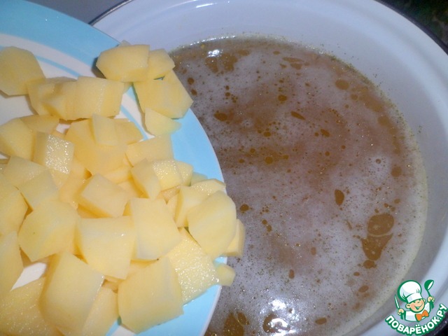У меня был готовый бульон, поставить его на огонь, как только закипит, выложить к нему картофель, нарезанный на кубики.