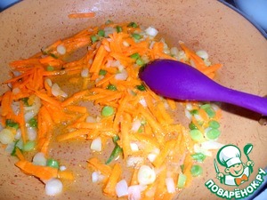 • Разогреть масло на сковороде, добавить нарезанный репчатый лук, белую часть зеленого лука и натертую морковь.