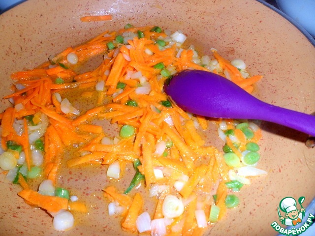 Разогреть масло на сковороде, добавить нарезанный репчатый лук, белую часть зеленого лука и натертую морковь.