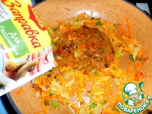 Добавить в сковороду натертые соленые огурцы и к ним, заправку Магги для рассольника, перемешать.