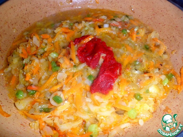 Затем добавить томатную пасту и немного бульона из кастрюли, тушить минут 5 на медленном огне.