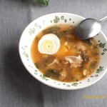 Готовый расольник разлить по тарелкам. При подаче добавить отварное яйцо и сметану.