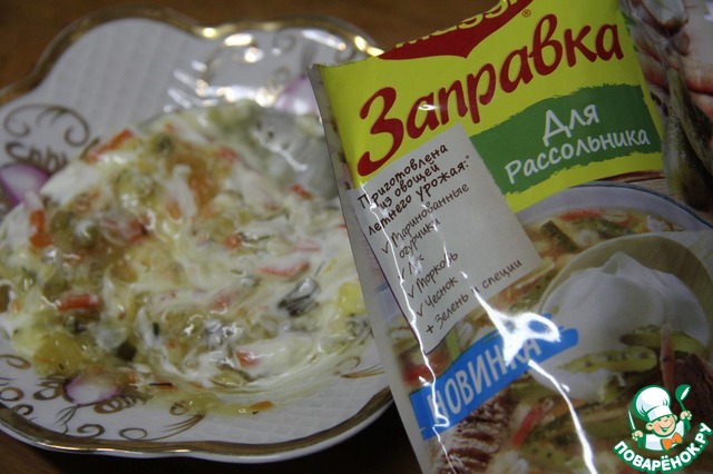 • Приготовить заправку: смешать сметану и заправку Maggi для рассольника. Перемешать.