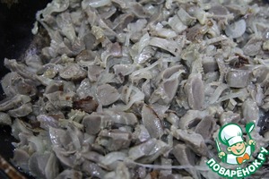 • К луку добавить нарезанные соломкой желудочки и подготовленный соус. Перемешать.