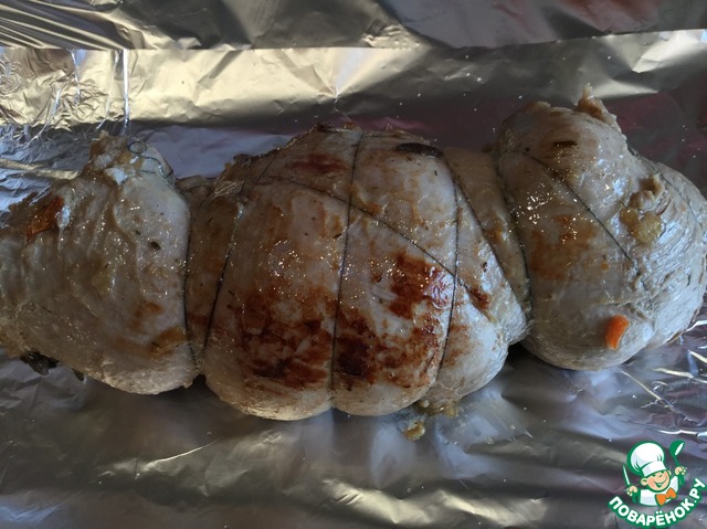 Обжарьте рулет в смеси растительного и сливочного масел со всех сторон до румяной корочки. Заверните в фольгу и уложите в форму для запекания. Готовьте в духовке 3 часа.