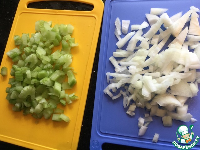 Духовку разогрейте до 120 градусов. Мелко нарежьте лук и сельдерей.