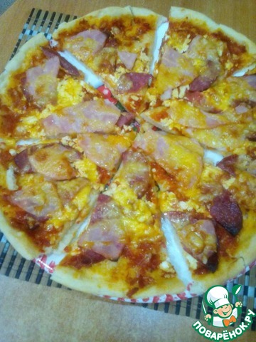 Пицца с соусом "Итальяно" и заправкой "Магги". Дорогие поварята, предлагаю вам попробовать пиццу с очень вкусным, пикантным соусом. И тесто, и соус - моя основа всех пицц, меняю только начинки. Раньше добавляла в соус и начинку соленый или маринованный огурчик, а теперь с заправкой для рассольника "Магги" это упростило приготовление в разы. Вкусное и приятное при разделке тесто. Соуса делаю больше, чтобы был в запасе. Его можно применять и с овощами, и с мясом, и с рыбой. Хранится в холодильнике до 5 дней, но расходуется дня за два. Надеюсь, вам тоже понравится. Присоединяйтесь!