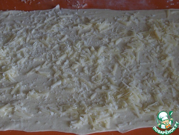 Из слоеного теста тонко раскатать два прямоугольника или квадрата одинакового размера. Один пласт теста слегка смазать мокрой ладонью, сыр натереть на крупной терке и распределить его по всей площади пласта.