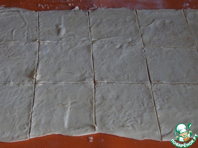 Ножом разделить тесто на одинаковые квадраты размером примерно 12Х12 см.