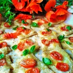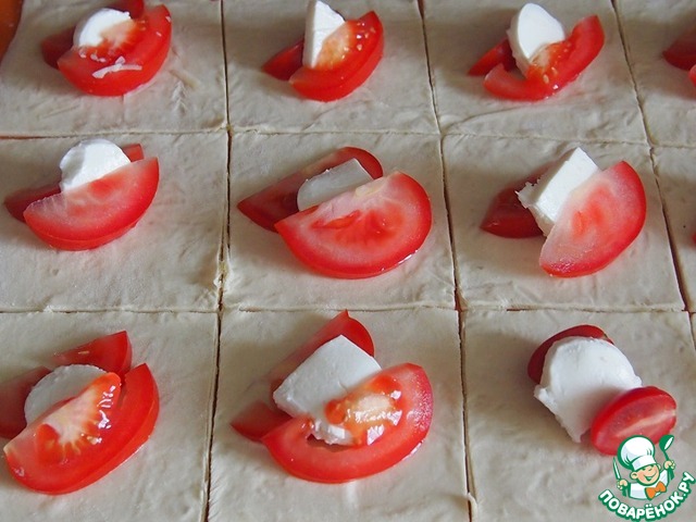 Помидор нарезать тонкими дольками и поместить по две дольки на средину каждого квадрата. Между дольками помидора положить кусочек моцареллы.