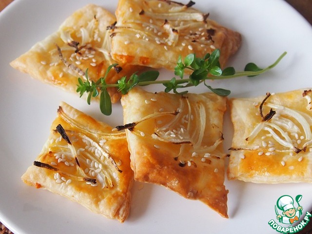 Обрезки теста я нарезала на кусочки, смазала яйцом, на каждый положила тонко нарезанный лук и посыпала кунжутом, получилось очень вкусно.